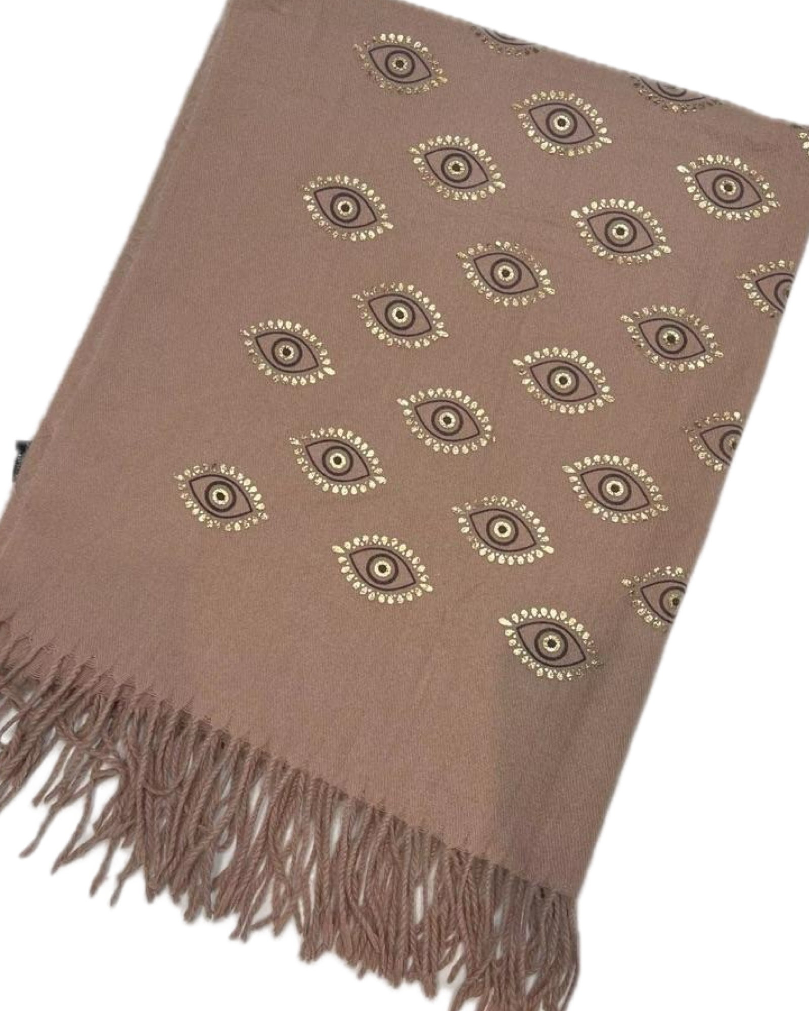 Warme, zachte wintersjaal met oog motief en een metallic gouden afwerking.